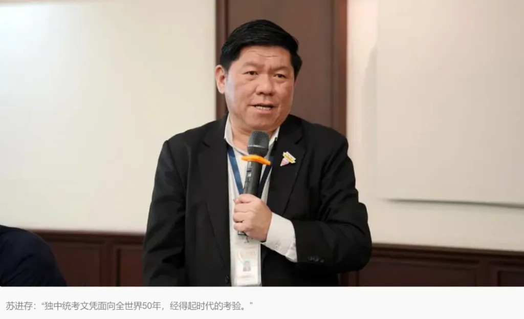 兴华中学校长苏进存在主持交流环节时,向嘉宾简介马来西亚华人与华教的历史。