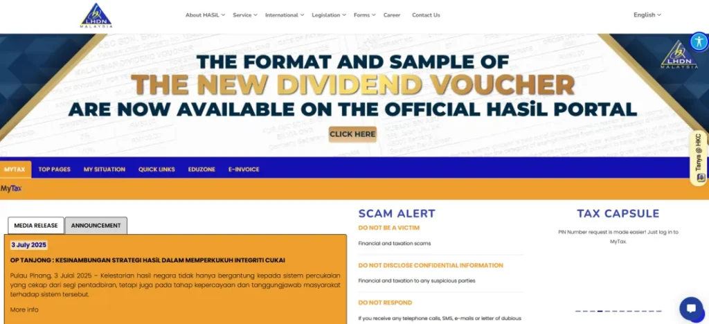 为了提升税务服务效率,LHDN 推出了官方线上平台「MyTax 我的税务门户」,整合了包括报税申报(e-Filing)、税单账单查询、网上缴税(ByrHASiL)、税号与资料更新、表格下载、申诉追踪、预缴税调整等功能,企业与个人用户均可通过该平台完成日常涉税操作。🔗官网:https://mytax.hasil.gov.m