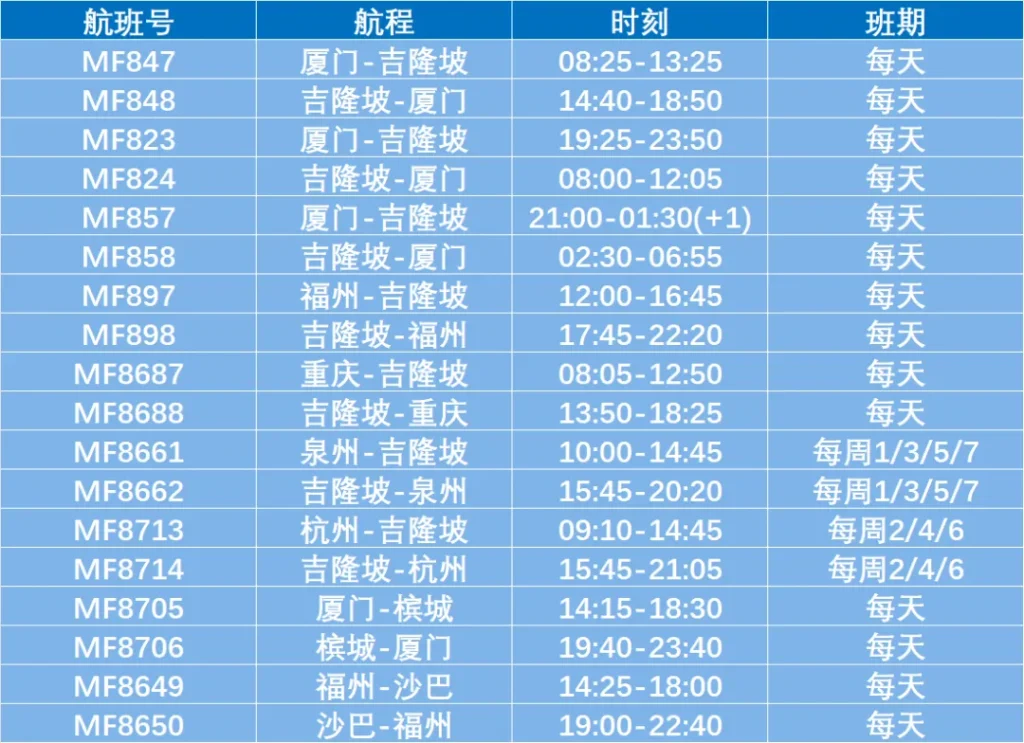 2025年10月26日起,厦门航空每周自马来西亚出发的航班为56班: