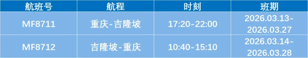 同时,在2026年3月13日-28日期间,为了满足马来西亚旅客开斋节期间出游的需求,厦门航空新增一班吉隆坡重庆航班,航班信息如下: