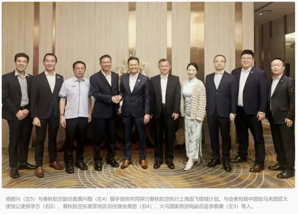 杨顺兴表示,他早在2023年曾陪同旅游部长张庆信拜访春秋集团总部,双方当时已探讨开辟马中更多城市直航的潜力,并于近期成功实现首阶段成果。他强调,若春秋航空成功开通上海直飞槟城航线,将对槟州与整个北马地区的旅游及商务发展带来重大利好。