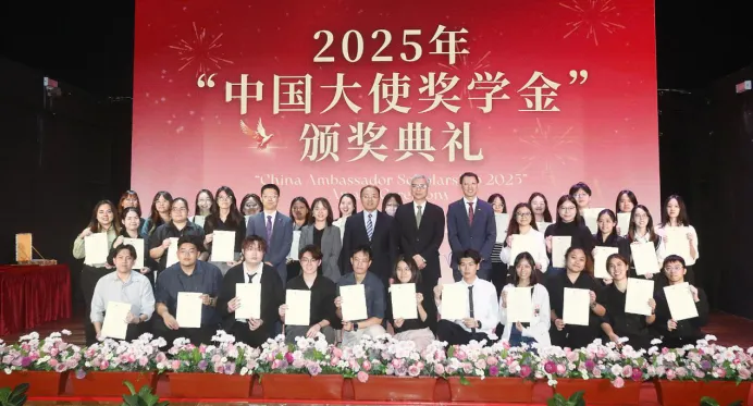 欧阳大使指出,今年 4 月,习近平主席对马来西亚成功进行国事访问,双方领导人共同宣布构建高水平战略性中马命运共同体,两国关系提升至新高度。10月召开的中共二十届四中全会审议通过“十五五”规划建议,为今后5年以及更长时期中国经济社会发展擘画了宏伟蓝图,中方愿同马方加强发展战略对接,培育壮大两国关系发展动能,拓展人文交流和教育合作,厚植友好民意基础。欧阳大使表示,近年来中马双向留学规模稳步增长,青年交流日益活跃,高校科研合作不断升级。我们设立“中国大使奖学金”,旨在鼓励品学兼优的青年学子积极投身中马友好交流,增进两国人民相知相亲。欧阳大使向“中国大使奖学金”获得者颁发获奖证书并勉励同学们志存高远、勇于创新,把握时代机遇,把个人理想融入国家与社会发展,为构建高水平战略性中马命运共同体贡献更多力量。