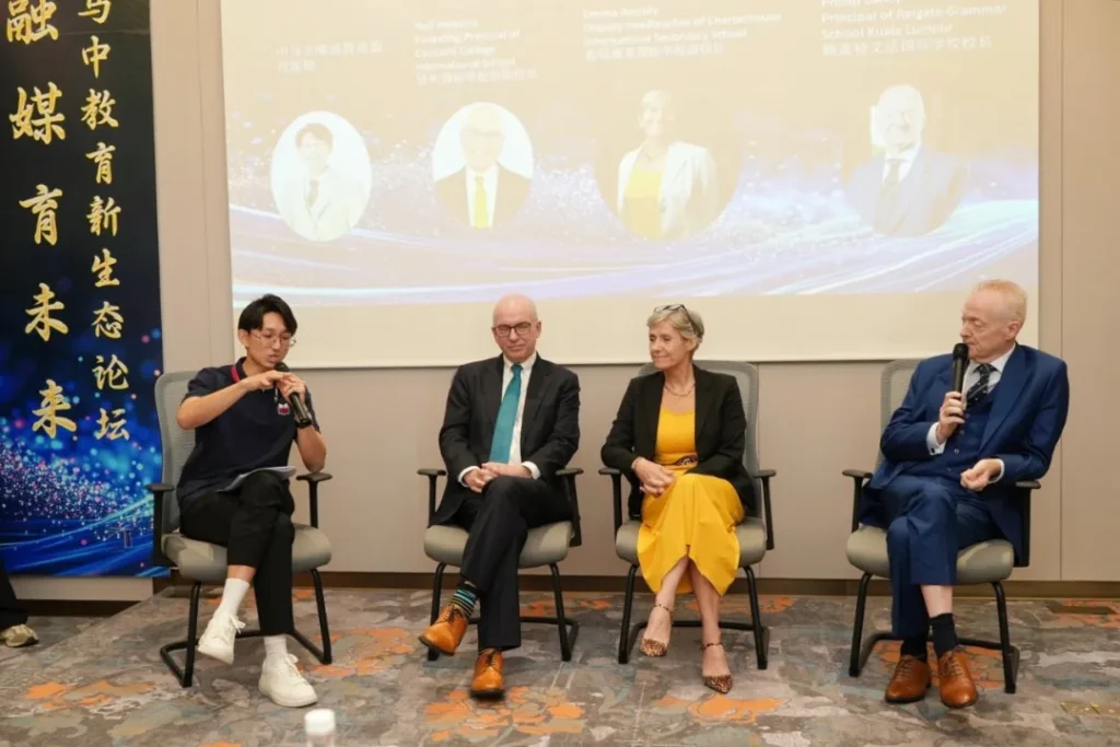 接下来,进入专题交流环节,其中“低龄阶段国际教育专题论坛”作为重点议题之一。论坛特别邀请了三位国际教育嘉宾:赖盖特文法国际学校校长 Phillip Bailey、查特豪斯国际学校副校长 Emma Rooney,以及协和国际学校创始校长 Neil Hawkins,围绕“终身学习”主题展开了深入对话。
