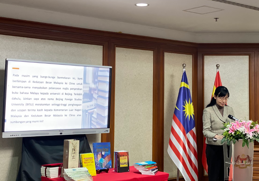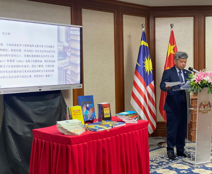 2022年3月29日,马来西亚驻华大使馆成功举办马来语图书赠送仪式,向北京外国语大学与中国传媒大学各赠送了41本马来语言书籍。这套书由马来西亚国家语文及出版局(Dewan Bahasa dan Pustaka)出版,内容包括文学、小说、百科全书和修订材料供马来语专业学生与马来语爱好者翻阅。
