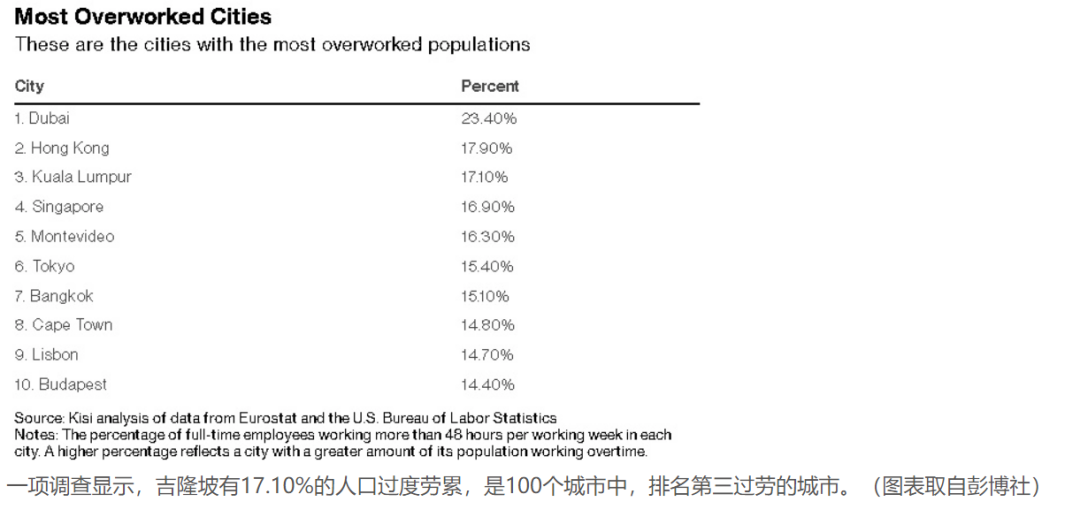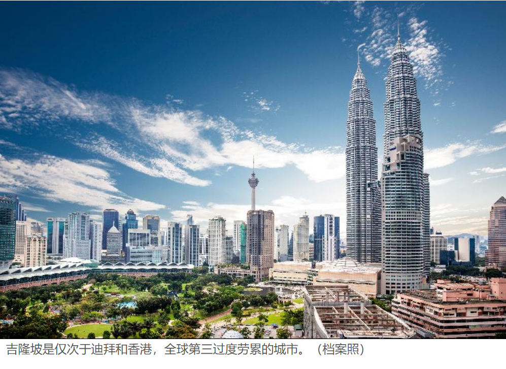 调查显示,吉隆坡有17.1%的人口过度劳累,迪拜和香港则分别有23.4%和17.9%的人口过度劳累,排在榜首和第二名。
