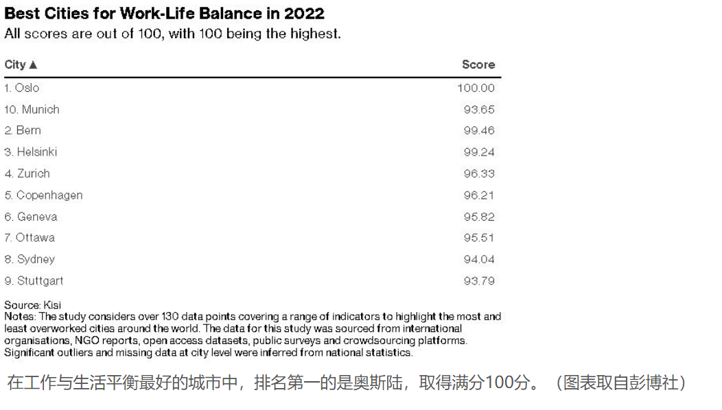 在工作与生活平衡最好的城市中,排名第一的是奥斯陆,得分为100分(最高),其次是伯尔尼以及赫尔辛基,得分均在99分及以上。