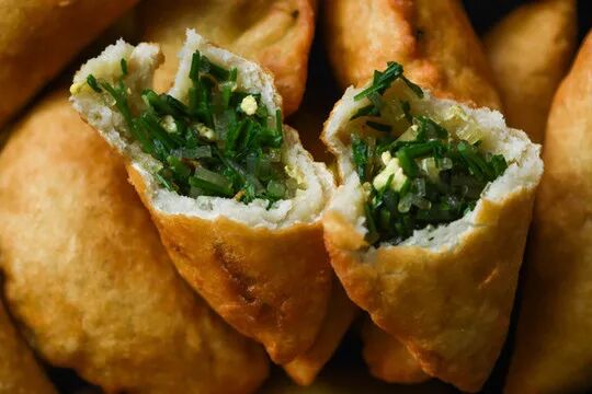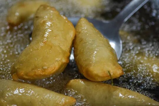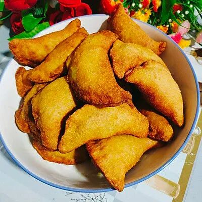 菜角和糖糕都用烫面炸制,菜角的馅一般以韭菜、鸡蛋、粉条为主,视各家土豪程度不同而原料略有添加,一般会包成大饺子状,呈半月形,时间充裕时主妇们还会包出花边。