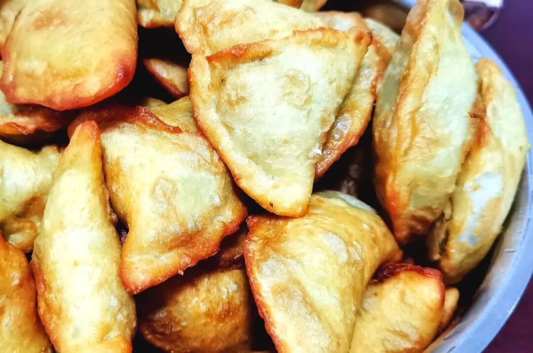 炸好的菜角糖糕,面皮金黄酥脆,外焦里嫩,本身就带着新麦面的香甜,炸菜角馅料饱满而鲜香爽口,炸糖糕糖汁稠润又半融于面里,咬下去满口甜香。