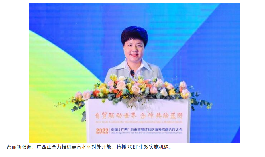她强调,广西正全力推进更高水平对外开放,抢抓区域全面经济伙伴关系协定(RCEP)生效实施机遇,加快打造面向东盟更好服务“一带一路”的开放合作高地、国内国际双循环重要节点枢纽。