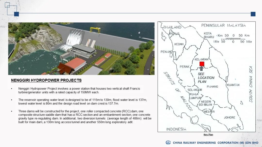 能吉利水电站项目位于马来西亚吉兰丹州,项目业主为马来西亚国家能源公司Tenaga Nasional Berhad(“TNB”),总装机容量300兆瓦,中标工程范围包括一座复合结构混凝土重力坝(马鞍坝)、一座混凝土重力节流坝(调节坝)、导流洞、电站厂房及其他附属水工结构等,计划于2026年完工。