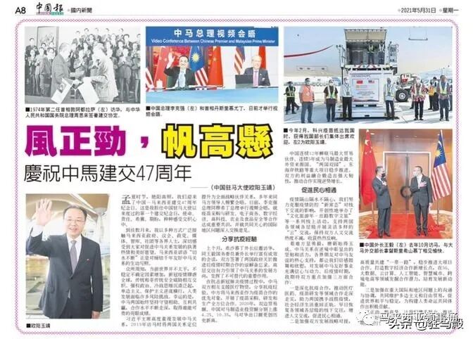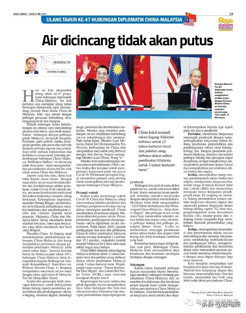 孟夏时节,艳阳高照,我们迎来了中国—马来西亚建交47周年纪念日。这是我担任中国驻马大使以来度过的第一个建交纪念日,使命、责任、希冀、期盼,种种感受交织心中。到任数月来,我以多种方式广泛接触马来西亚政府、议会、政党、媒体、智库、社团等各界人士,深切感受到大家对促进中马关系发展的执着热情和美好愿望。马来西亚谚语“切水不断”正是对缔结千年友好中马关系的生动写照。