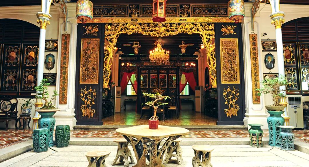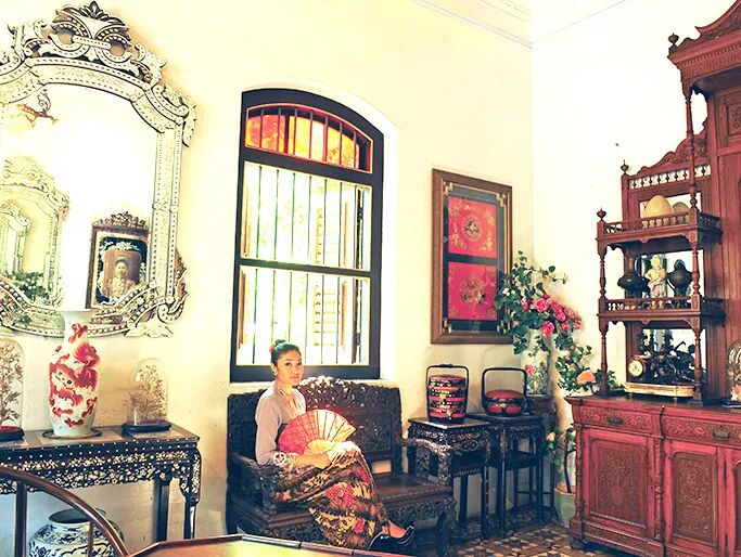 中央庭院呈现出完美的豪宅景观,区域内深色的木制家具与盆景树相得益彰。在新婚房,你会一睹过去的新婚夫妇的房间,一间以木橱柜等复古家具装饰浓重的房间,一张化妆桌,以及独特的床架,真正展示了峇峇娘惹的独特艺术。