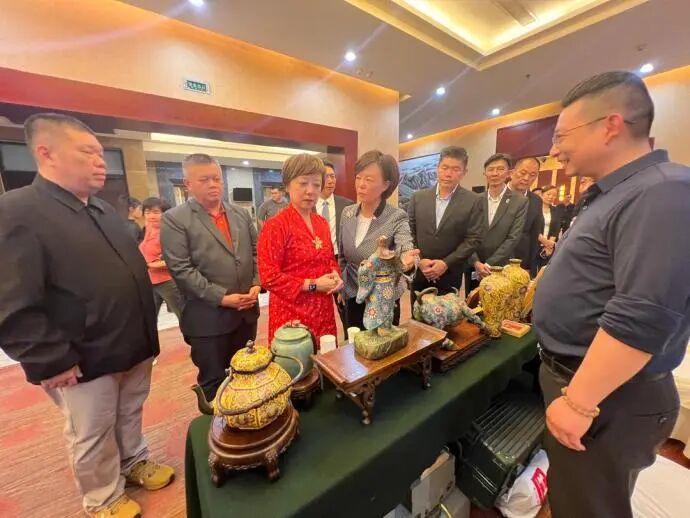 张锐(左四)介绍运城非遗文创产品。左起孙艪华、吴金财及陈丽群,左五起朱建华、杨文来及萧妙光。