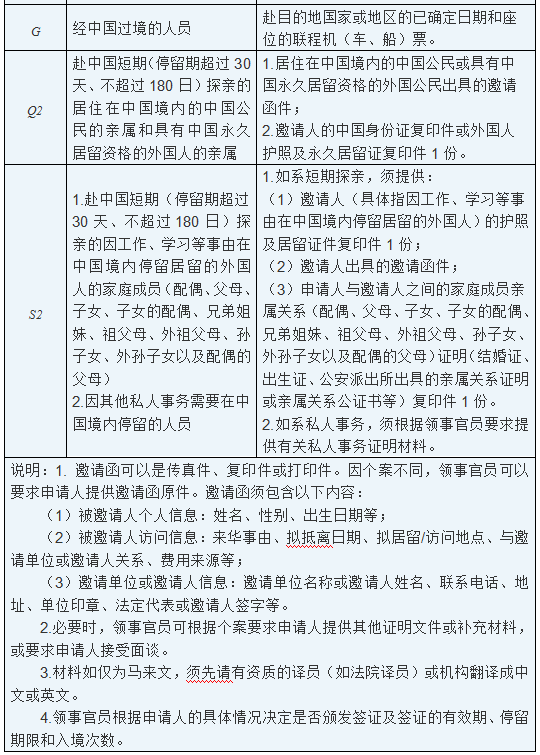 (五)符合条件的马来西亚公民仍可申办停留期超过30天的旅游、商贸、探亲、私人事务类多次签证。除上述(一)至(四)项材料外,还需提供曾获发的中国签证或相应次数的赴华记录:1. L字(旅游)签证:(1)如乘邮轮赴华且需要多次出入境的申请人,可凭邮轮公司出具的多次入境中国的行程证明申请有效期不超过3个月的多次L字签证;(2)其他拟多次赴华旅游人员须提供详细的旅游行程安排及相对应的不可撤销的机票、酒店订单等,并提供以往持旅游签证赴华的记录,可申请有效期不超过1年的多次L字签证。2. M字(商贸)签证(1)申请半年至1年多次M字签证,需提供5年内曾获发的中国签证复印件1份;(2)申请2年多次M字签证,需提供曾获发的半年至1年多次中国签证复印件1份,或5年内曾有3次及以上赴华记录的复印件各1份;(3)申请3年多次M字签证,需提供5年内曾获发的2年多次中国签证复印件1份,或曾2次及以上获发的1年多次中国签证复印件各1份,或曾有5次及以上赴华记录的复印件各1份。3. Q2字(探亲)签证(1)申请半年至2年多次Q2签证,需提供5年内曾获发的中国签证复印件1份;(2)申请3年至5年Q2字签证,需提供曾获发的2年多次中国签证复印件1份,或曾2次及以上获发的1年多次签证复印件各1份。4. S2字(私人事务)签证如系短期探亲,可申请有效期不超过邀请人在华停留期限的多次S2字签证;如系其他私人事务,(1)申请半年至1年多次S2字签证,需提供5年内曾获发的中国签证复印件1份;(2)申请2年多次S2字签证,需提供曾获发的半年至1年多次中国签证复印件1份,或5年内曾有3次及以上赴华记录的复印件各1份;(3)申请3年多次S2字签证,需提供5年内曾获发的2年多次中国签证复印件1份,或曾2次及以上获发的1年多次中国签证复印件各1份,或曾有5次及以上赴华记录的复印件各1份。(六)东盟签证2025年6月9日起,符合要求的马来西亚商务人员及其配偶、子女可申请5年多次、停留期最长为180日的相应类别来华签证。三、咨询方式和受理地址(一)关于普通签证的咨询,请径联系马来西亚中国签证申请服务中心:签证中心工作时间:递交申请时间:9:00-15:00交费取证时间:9:00-16:00咨询电话:006-03-89663925(工作日13:00-17:00)电子邮箱:klcentre@visaforchina.org地址:Level 6, Hampshire Place Office, Jalan Mayang Sari, 50450 Kuala Lumpur, Malaysia (二)持外交、公务护照人员及外交、公务、礼遇等签证申请咨询,请径联系使馆领事侨务处:电子邮箱:kl_visa@csm.mfa.gov.cn传真:0060-3-21636809地址:1st Floor, Plaza OSK, 25 Jalan Ampang, 50450 Kuala Lumpur, Malaysia(三)在东马的签证申请人,请参阅中国驻古晋、哥打基纳巴卢总领馆网站通告。