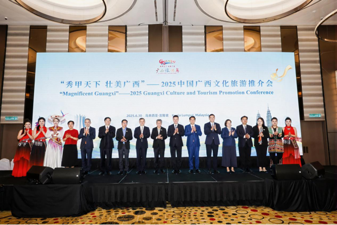 6月30日,2025中国广西文化旅游推介会在吉隆坡举行。广西壮族自治区人民政府胡帆副主席、中国驻马来西亚大使馆郑学方公使、马来西亚旅游、艺术和文化部沙哈鲁丁秘书长、马来西亚国家旅游局李泰康副局长、马六甲州对华事务特使林万锋、雪兰莪州旅游局总执行长蔡依霖等嘉宾出席。