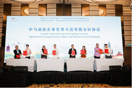 沙哈鲁丁秘书长表示,马中两国一直保持着密切的外交关系,近年来,两国在文旅领域的合作蓬勃发展。广西和马来西亚相距遥远,但两地有着深厚的历史渊源,并共同坚信文化和旅游的凝聚力。马来西亚全力支持“2025广西旅游年”,通过持续合作,双方可以深化文化纽带,巩固两国人民友谊。本次推介会通过现场宣介、文艺表演、现场签约等形式推广广西特色文旅资源,120余名与会嘉宾们共同见证了中马旅游企业签署互送客源友好协议。