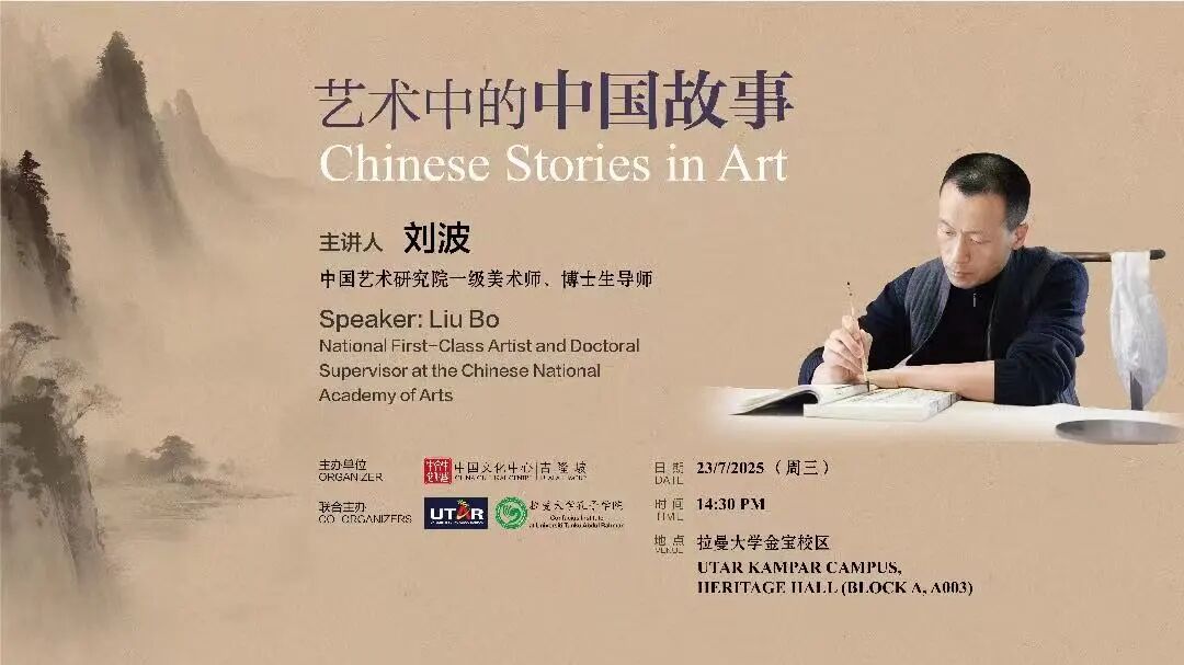 由吉隆坡中国文化中心主办的“艺术中的中国故事”系列讲座,于7月22日至23日分别在吉隆坡及霹雳州金宝成功举办。中国艺术研究院一级美术师、博士生导师刘波教授应邀主讲,两场活动吸引当地200余名艺术、文化、学术界及社会各界人士参与,现场反响热烈。
