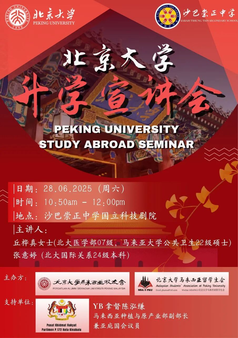 6月28日,由北京大学马来西亚校友会携手北京大学马来西亚留学生会、沙巴亚庇崇正中学联合举办的 「北京大学升学宣讲会」 在崇正中学科技剧院圆满举行,吸引近百位学生与家长热烈参与,共同见证这场启迪未来的盛会。