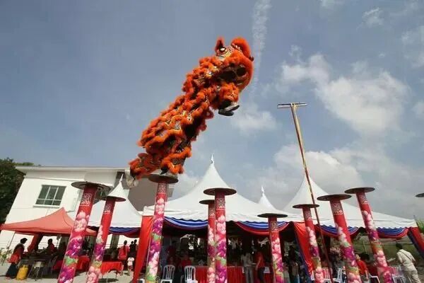 相信大家都看过高桩舞狮吧!在大马,不论是华人过年、或是新店家开幕,都会邀请舞狮前来助兴表演,踩在高高的桩台上,活灵活现的舞狮跳上跳下好不热闹!“舞狮”这个习俗源自于中国,是的,没错,但马来西亚的舞狮的不同之处是它踩在高桩上。大马的高桩舞狮习俗源自于 1983 年,当时的一个大马本土的舞狮团 Hing Tung Lok 为了让表演更为精采,加入了 5 根柱子(又称为梅花桩),而其他的舞狮团看到了,也跟风做出了一整套的柱子,有些柱子的高度还超过了 20 尺!久而久之,就变成大马舞狮团固定的传统习俗表演了,厉害到外国都来取经学习呢。