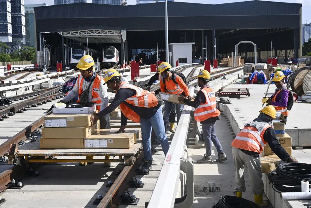 工人在马来西亚柔佛州跨国轨道交通项目柔新捷运系统(RTS)列车段场外忙碌。新华社记者程一恒摄