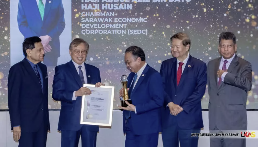砂拉越總理拿督巴丁宜丹斯里阿邦佐哈里(左2)頒發東盟傑出商業領導終身成就獎於砂經濟發展機構主席丹斯里阿都阿茲(右3),右起為東盟商務俱樂部主席丹斯里穆尼爾和東盟經濟俱樂部主席兼KSI亞太戰略研究院院長丹斯里楊元慶,左1為KSI亞太戰略研究院副主席莫哈末依巴。