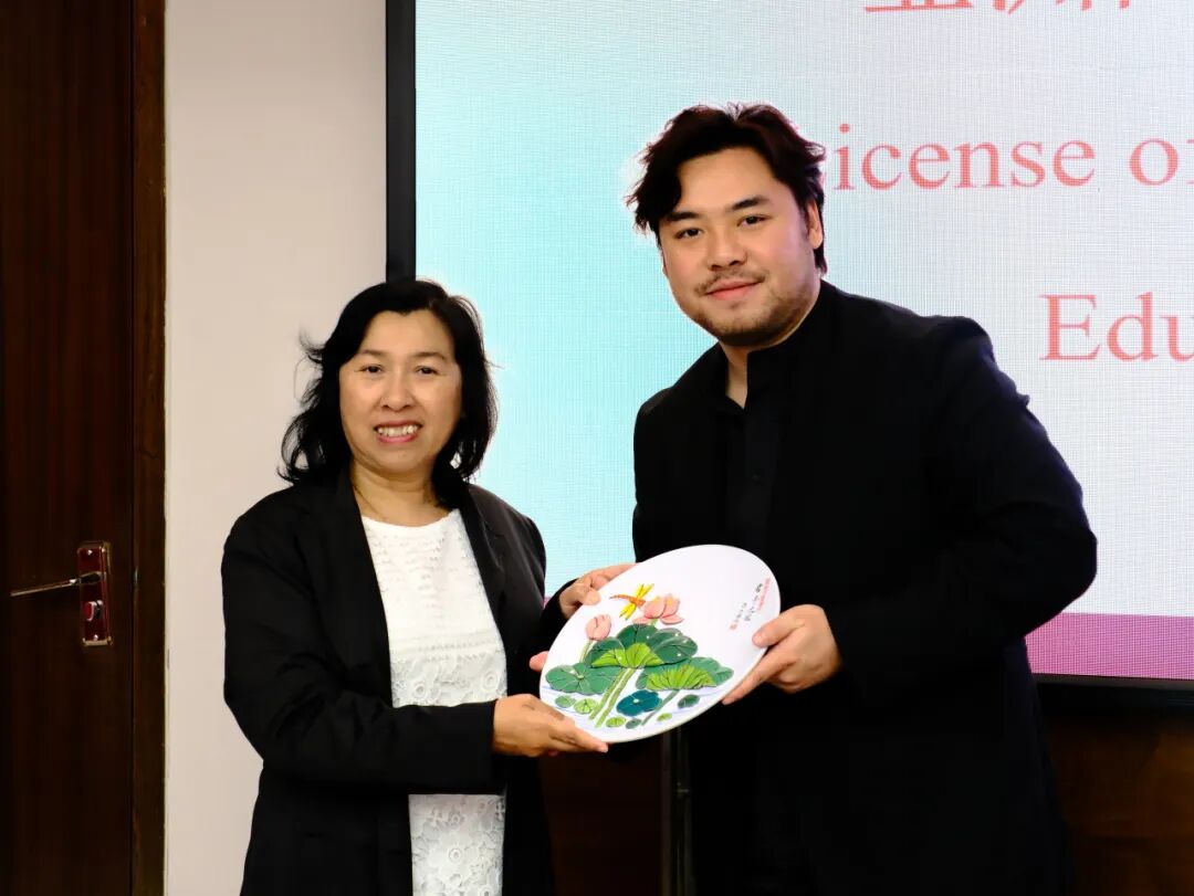 随后,在与会人员的共同见证下,亚洲国际教育联盟秘书长杨华昕授予我校“亚洲国际教育联盟会员单位”,校长廖俊杰代表我校领取授牌。此次授牌不仅是对我校国际化办学成果的认可,更是学校持续推进开放合作、积极融入全球职业教育体系的重要体现。仪式后,双方互赠了精心准备的礼物。礼物不仅承载着各自的文化特色与美好祝愿,更是友谊与合作的象征,为此次访问留下了难忘的纪念。