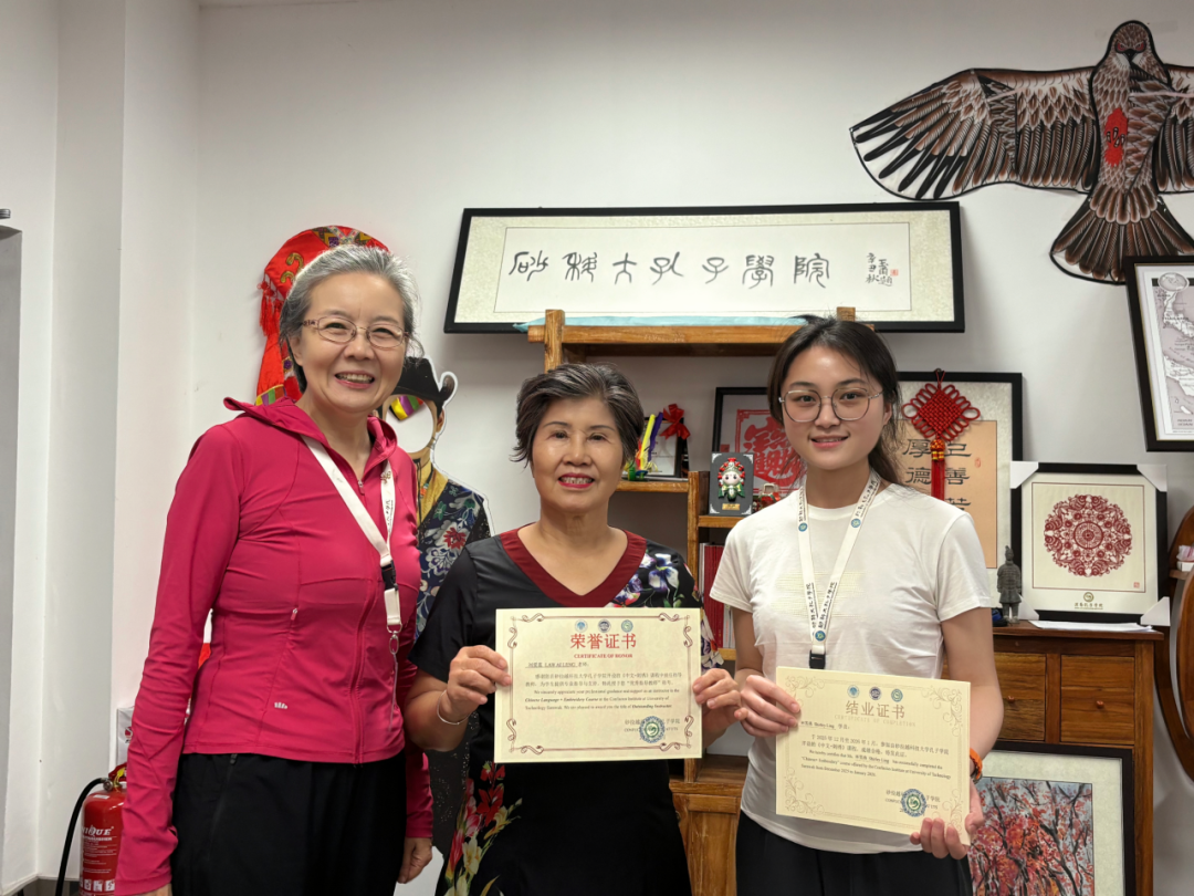 作为孔院“中文+刺绣”特色课程体系的关键实践,该课程打破传统语言教学单一模式,将非遗手工艺与中文教学有机结合。学员们在动手创作中感受中华美学理念与非遗传承内涵,摆脱死记硬背,在沉浸式体验中主动亲近中文、读懂中国文化。结业之际,学员们展示的刺绣作品针脚细密、构图精巧,每件作品都承载着对中华文化的喜爱。