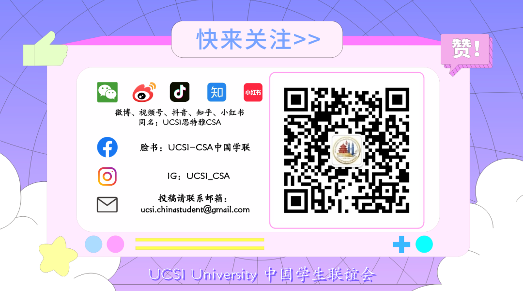 UCSI大学中国学生联谊会(UCSI University China Student Association,简称UCSI中国学联、UCSI-CSA)是UCSI大学官方唯一注册认证,并在中国驻马来西亚大使馆指导与支持下开展工作的中国留学生组织。学联始终秉持“服务、团结、发展”的宗旨,致力于成为全体UCSI中国留学生在异国他乡的温暖之家与坚实后盾。其官方邮箱为ucsi.chinastudent@gmail.com